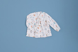 Camisa confeccionada en pana color blanco crudo con estampado de un día de lluvia, cuello redondo con pinzas y bolsillo plastón en la parte baja. Lleva manga larga con goma en el puño.